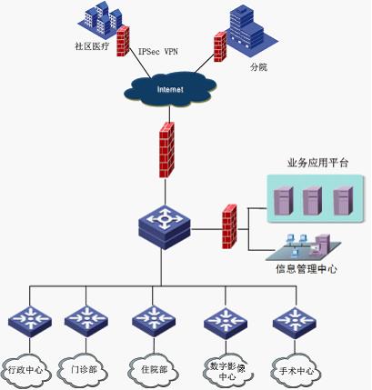 由于醫(yī)療系統(tǒng)中存儲了大量關鍵性需要保密的數(shù)據(jù),各醫(yī)院要通過防火墻的策略控制和抗攻擊功能來保護內(nèi)部網(wǎng)絡的安全,防止來自外部的非法的訪問和攻擊行為;