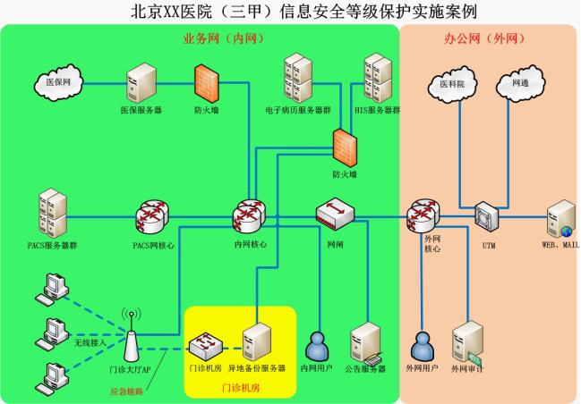 《醫(yī)療衛(wèi)生行業(yè)信息安全等級(jí)保護(hù)實(shí)施指南》明確提出并要求:醫(yī)療機(jī)構(gòu)信息系統(tǒng)中具有HIS、LIS、PACS等二級(jí)系統(tǒng)外,還具有醫(yī)院網(wǎng)站、OA系統(tǒng)的一級(jí)系統(tǒng),那么在不同等級(jí)系統(tǒng)互聯(lián)互通時(shí)采用安全隔離網(wǎng)閘、防火墻、入侵檢測(cè)等邊界安全設(shè)備實(shí)現(xiàn)互聯(lián)互通。