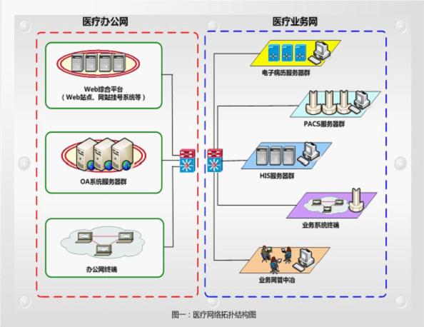 與此同時(shí),醫(yī)院為了開(kāi)展便民工程及辦公信息化工作還建設(shè)了網(wǎng)上掛號(hào)系統(tǒng)、OA辦公系統(tǒng)和終端上網(wǎng)平臺(tái)等,這些互聯(lián)網(wǎng)業(yè)務(wù)應(yīng)用與醫(yī)院核心業(yè)務(wù)系統(tǒng)交叉混合,使得核心業(yè)務(wù)系統(tǒng)面臨著病毒入侵、非法訪問(wèn)、非法外聯(lián)與DDOS攻擊等重大威脅。