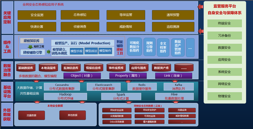 大數(shù)據(jù)安全監(jiān)管服務(wù)平臺(tái)架構(gòu)體系分為外部數(shù)據(jù)、基礎(chǔ)設(shè)施平臺(tái)、數(shù)據(jù)治理融合、組件與工具、關(guān)鍵應(yīng)用定制層,以及自身安全與保障體系。