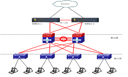 用戶內(nèi)網(wǎng)采用了全網(wǎng)冗余的部署,初期出口并沒有做冗余,這就增加了單點故障的風險,如果出口設(shè)備出現(xiàn)宕機,或者工作異常的情況都會對用戶的網(wǎng)絡(luò)造成影響,影響用戶業(yè)務(wù)的正常使用和開展,所以用戶希望在出口做網(wǎng)關(guān)設(shè)備的冗余